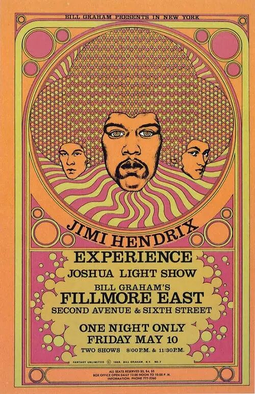 到了60年代中期,迷幻音乐给海报风格带来了极大的改变,伴随着更醒目、更具有创造力与更加鲜艳缤纷的设计,海报的风格也转化成更加戏剧化的状态。