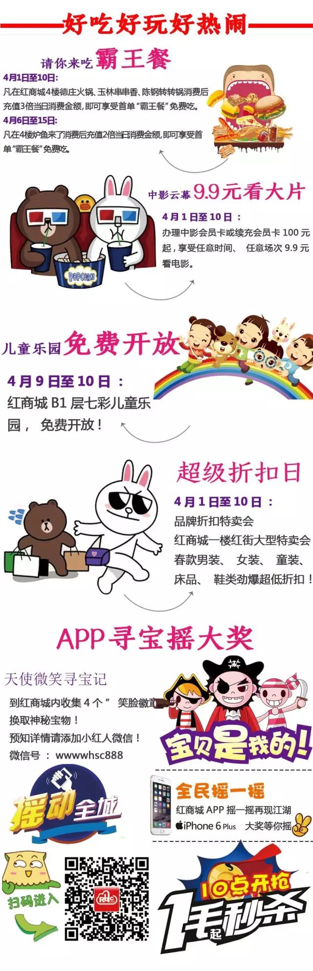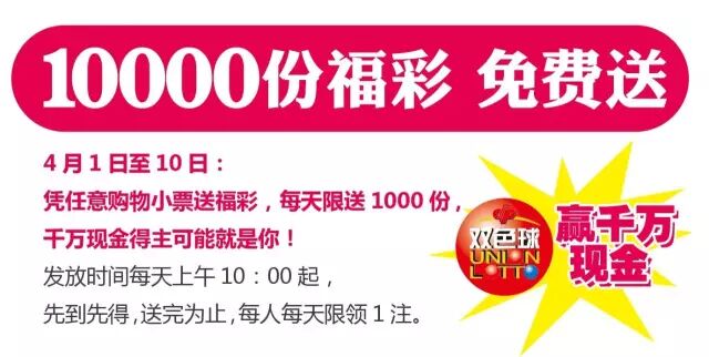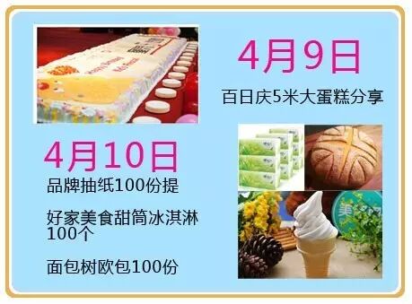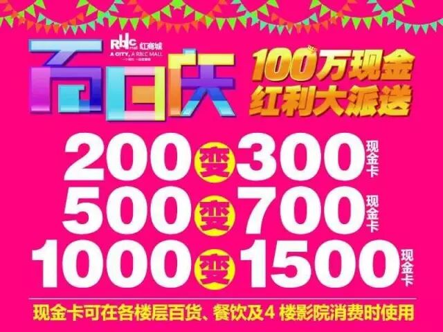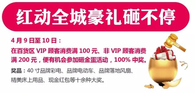 4月1日—10日15:00凭当天任意购物小票,即可免费领取礼品一份,每日限100份送完为止;无论有无消费,还可到活动现场参加百日庆转转乐,免费礼品每天再送100份;每天10:00红商城APP线上免费抢,再送100份。