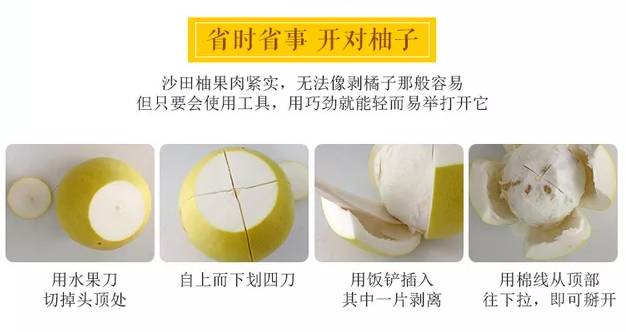 果农拿一个刚从树上采摘下来的金黄色的沙田柚,用小刀切开柚子皮,淡淡的柚香很舒服的溢进鼻腔,扯去海绵状的外皮,圆乎乎的果肉便裸露出来,用手使劲一掰,柚子那弯月牙儿似的肉瓣便分开了,虾肉色的果肉晶莹剔透,清甜可口。