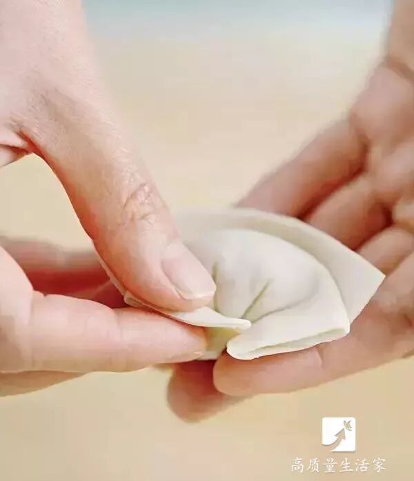 把皮两边压紧向馅中间包起来,让两边的皮粘在馄饨上。