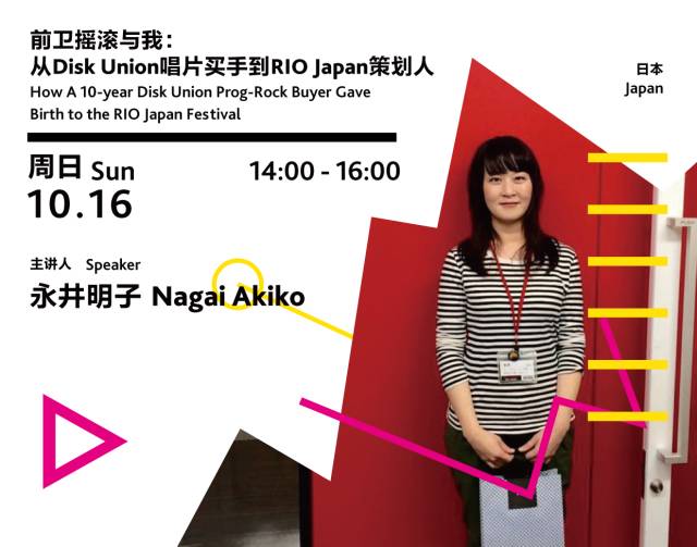 主讲人 Speaker:永井明子 Nagai Akiko 现场配有翻译 With Japanese-Chinese interpreter最初的Rock in Opposition音乐节在1978年3月12日于英国伦敦举办,一批不符合主流音乐厂牌市场价值观念的欧洲前卫摇滚乐队因它而聚集在一起。2011年登陆日本,由永井明子与RIO Japan委员会主理。永井明子已在Disk Union的前卫摇滚部门担任负责人超过10年。讲座中,永井明子将介绍她从Disk Union唱片买手到RIO Japan策划人的经历。The original Rock in Opposition took place on March 12, 1978 in London, England. It brought together European prog-rock bands united by their common un-marketability to major record labels.The fest sets foot in Japan in November 2014. It was chaired by Nagai Akiko. Nagai, head of Disk Union’s progressive rock department for 10 years, with RIO Japan committee.In the lecture, Akiko will talk about her experience evolving with Japanese prog-rock scene, from a 10-year Disk Union buyer to the curator RIO Japan Festival.