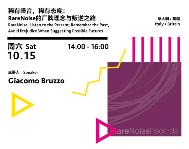 All lectures and workshop will be held in A3+主讲人 Speaker:Giacomo Bruzzo现场配有翻译 With English-Chinese interpreterRareNoiseRecords是一个由策划人Giacomo Bruzzo和音乐家Eraldo Bernocchi联合创办的伦敦独立唱片厂牌,致力于发现和传播最前沿的当代前卫音乐,在尊重和强调与艺术形式的历史关系的同时,保持着开放的态度,而不被关于音乐类型的固有观念所束缚。讲者将会分享他们如何在21世纪运营一个唱片厂牌:尊重历史,侦测当代音乐的走向,并带你一窥未来的可能性。Based in London, RareNoiseRecords is an independent record label co-founded by Italian entrepreneur Giacomo Bruzzo and Italian musician and producer Eraldo Bernocchi. The label's mission is to detect and amplify contemporary trends in progressive music, by highlighting their relation to the history of the art-form, while choosing not to be bound by pre-conceptions of genre.The lecture is about how we built a record label in the 21st century by respecting history, detecting contemporary trends in music, and offering glimpses of the future.