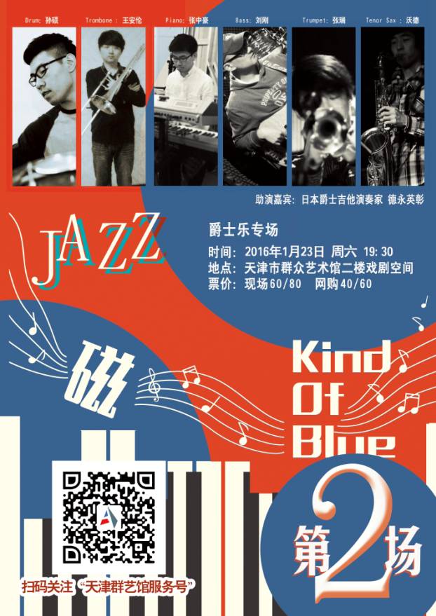1月23日(本周六)晚19:30,磁乐队——"Another kind of blue and Abstract truth"致敬Miles Davis和Oliver Nelson爵士乐专场演出将在天津市群众艺术馆二楼戏剧空间举行,日本爵士吉他演奏家德永英彰助演。