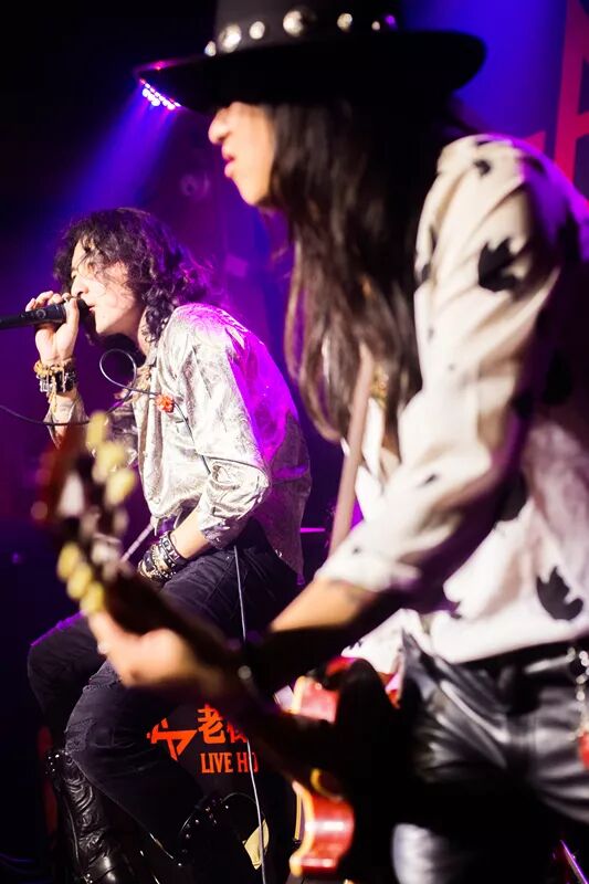 不论在台上还是台下都是大众印象里的摇滚乐明星,长卷发,牛仔,皮靴,发带。