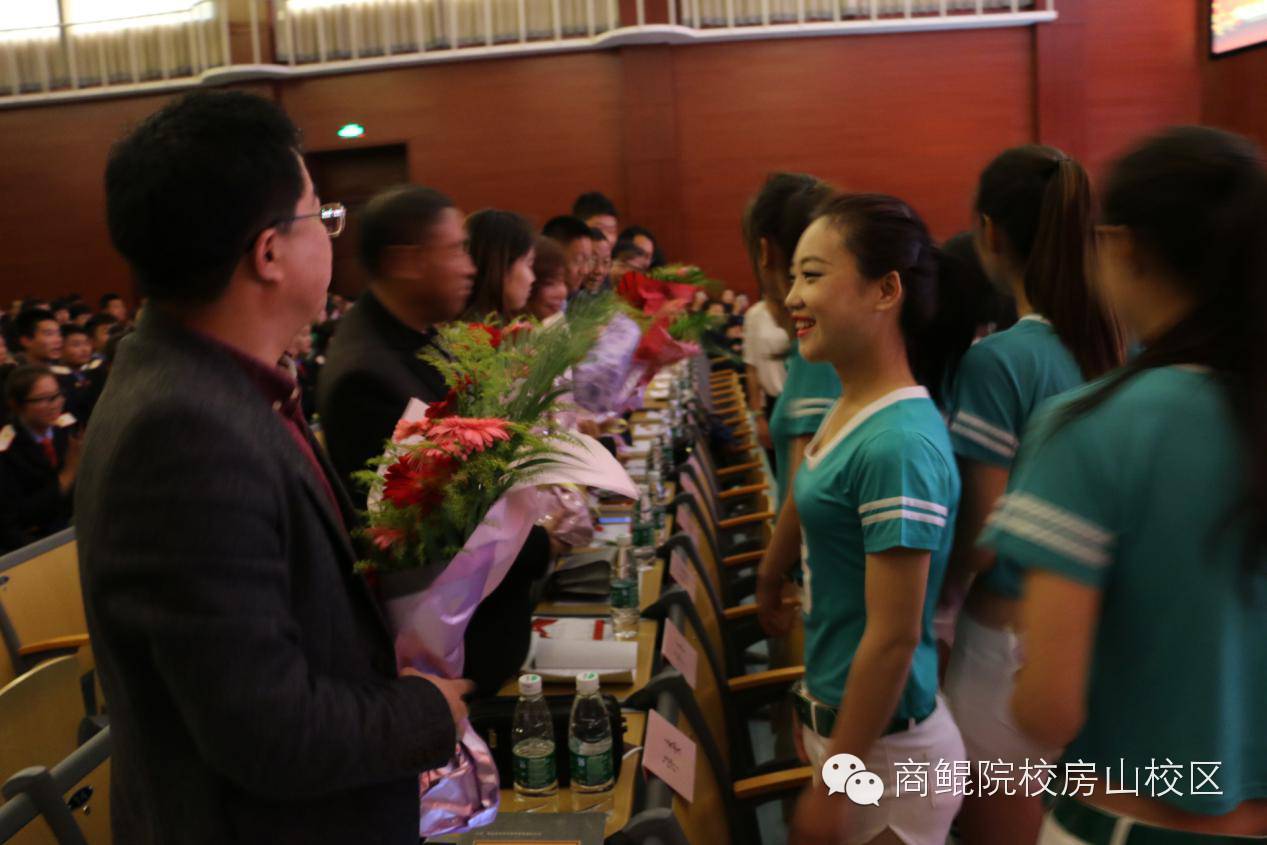 由周雅楠,刘瑞敏等同学带来的精彩的啦啦操表演《向前冲》同学们为领导们献花。