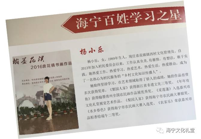 2013年3月对于杨小乐来说,是一个特别的日子,因为这一天她加入了袁花镇镇西村村民委员会,成了一名乡村文化的建设者,从此在这个平凡的舞台上开始了她的职业生涯。