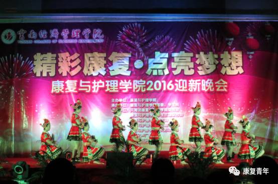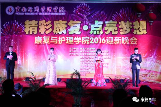 2016年12月19日19:00,康复与护理学院“精彩康复·点亮梦想”2016年迎新晚会在海源校区体育馆隆重举行。云南经济管理学院党委副书记、副院长刘相副教授、云南经济管理学院招生处处长王艳琴副教授、云南经济管理学院就业处处长蔡发书老师、云南经济管理学院招生处副处长卓志沅老师、康复与护理学院院长章杨杰老师、康复与护理学院党总支书记曾永群老师、康复与护理学院副院长许银凤老师、康复与护理学院党总支副书记高攀老师、康复与护理学院办公室主任娄忆川老师、康复与护理学院教学科科长谢秋霞老师、康复与护理学院学生科科长王超老师及康复与护理学院全体教师、2016级新生观看了此次晚会。 晚会由贺云凤、马穆拉奇、钟家驹、蒙小飞主持。
