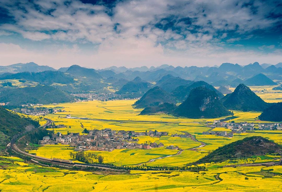 罗平东北方向的金鸡峰是观赏油菜花海的好去处,登上金鸡峰,绵延不绝的油菜花田美景尽收眼底,眺望远方,又有孤峰拔起宏伟壮阔。有很多罗平花海的精美大片都是在这里拍摄的。