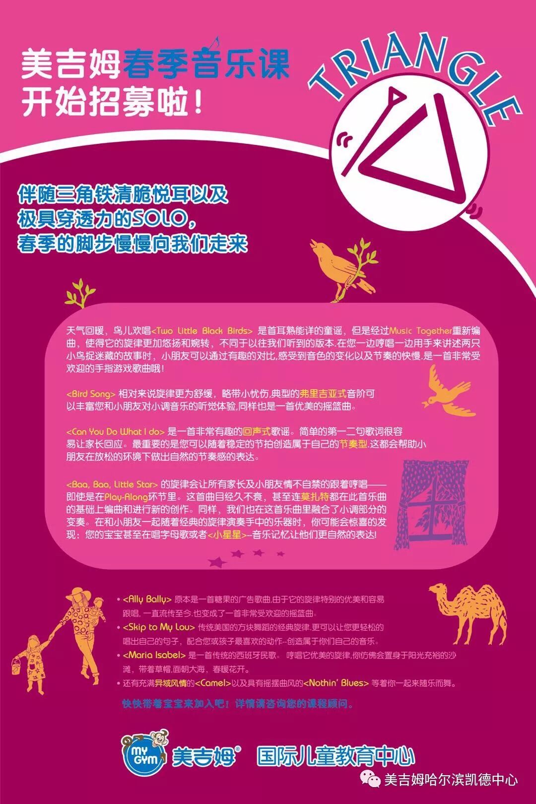 美吉姆Music Together音乐课45分钟的课程包含了大运动、小运动、手指游戏、自由舞蹈、孩子坐在妈妈大腿上一起进行的音乐和歌曲活动、乐器探索和孩子一起创作音乐的环节。