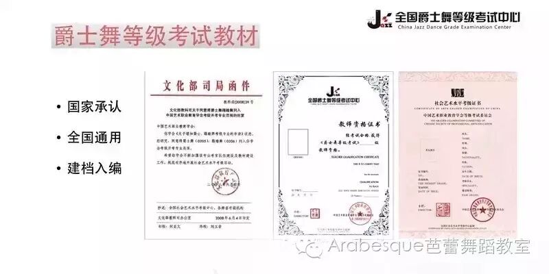《全国爵士舞等级考试教材》隶属于中国艺术职业教育学会,是目前中国爵士舞(Jazz Dance)权威认证机构,主管单位是中华人民共和国文化部。