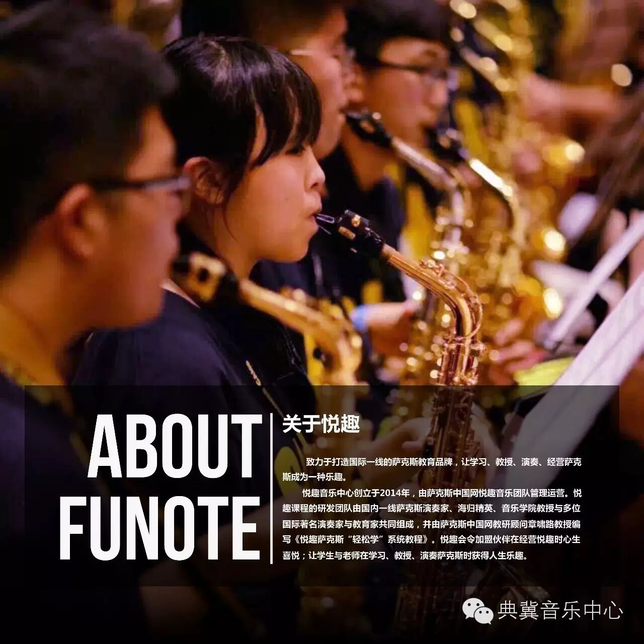 悦趣音乐中心创立于2014年,由萨克斯中国网悦趣音乐团队管理运营,悦趣课程的研发团队由国内一线萨克斯演奏家、海归精英、音乐学院教授与多位国际著名演奏家与教育家共同组成,并由萨克斯中国网教研顾问章啸路副教授编写《悦趣萨克斯“轻松学”系统教程》作为体系教材之一。致力于打造国际一线的萨克斯教育品牌,让学习、教授、演奏、经营萨克斯成为一种乐趣。