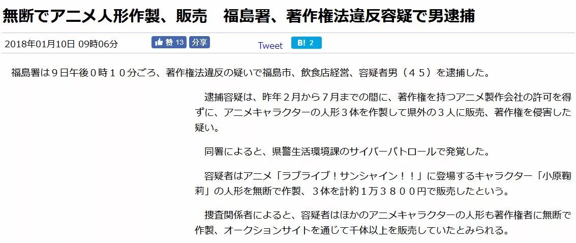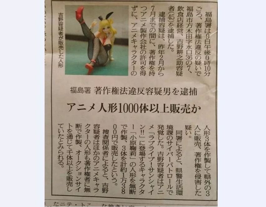 近日日媒就报道了一名45岁的岛国大叔销售未经授权的动画手办而被警方逮捕的案件。该嫌疑人从2017年2月至7月期间在没有获得动画制作公司许可的情况下制作了三款动画角色手办,一共获利1万3800日元(约合803元人民币)。随后根据调查,该男子已销售上千款自制手办。