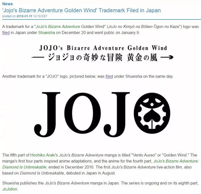《JOJO的奇妙冒险》以它独特的魅力,累积了不少的死忠粉。最近一些粉丝就发现集英社申请注册 了《JOJO的奇妙冒险:黄金之风》的商标。这是不是代表JOJO第五部就要动画化了?