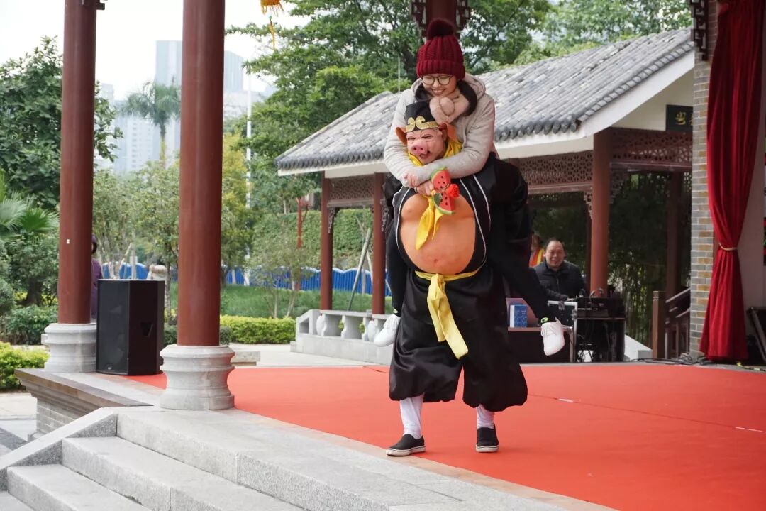 下一个节目,迎来了一位“不速之客”。这位“穿越”而来的猪八戒虽憨态可掬,但是跳起舞来尤其灵活。八戒还到台下找了一位“嫦娥姐姐”,上演了一场“猪八戒背媳妇”的戏,逗得台下的观众捧腹大笑。