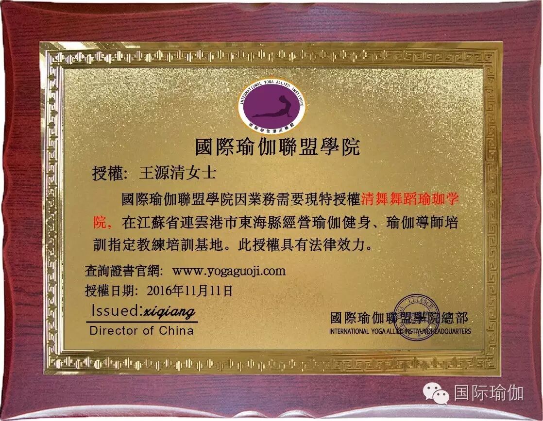 国际瑜伽联盟学院现授权清舞舞蹈瑜伽学院,在江苏省连云港市东海县唯一指定经营瑜伽健身,瑜伽教练培训基地,为清舞舞蹈瑜伽学院-国际瑜伽联盟学院教练培训基地。此授权具有法律效力。