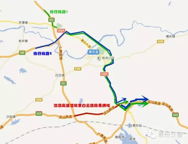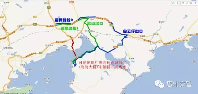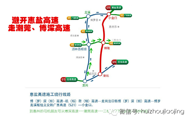★由深圳、东莞、珠海等方向前往河源、江西方向的车辆,建议避开惠盐高速,走潮莞、博深高速至广惠高速,然后再转惠河高速。★到惠州的司机朋友可从博深高速---潮莞高速---三栋出口下高速进入惠州市区。