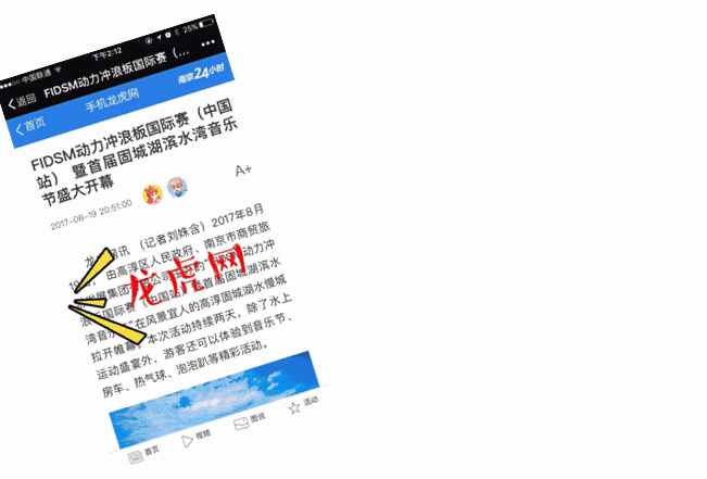 8月19日, 由高淳区人民政府、南京市商贸旅游发展集团有限公司主办的“FIDSM动力冲浪板国际赛(中国站)暨首届固城湖滨水湾音乐节”在风景宜人的高淳固城湖水慢城拉开帷幕。本次活动持续两天,除了水上运动盛宴外,现场还可以体验到音乐节、房车、热气球、泡泡趴等精彩活动。
